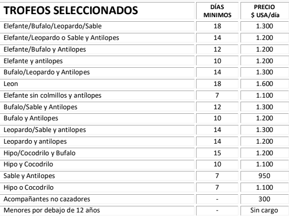 - No incluye: vuelos, tasas de abate, seguros, alquiler de rifle/munición, entrada a parques o reservas, propinas, bebidas alcohólicas, 2% impuesto del gobierno “LEVY” sobre tasas de abate y gastos, IVA: 45 $ por día y persona, tasa antifurtivo 270 $, tasas de abate el 4%.