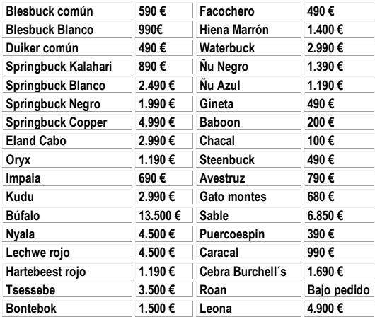 No incluye: vuelos, tasas de abate, seguros, alquiler de rifle/munición, entrada a parques, propinas, bebidas alcohólicas, empaquetado, preparación y desinfección de trofeos, transporte de trofeos a España (aduanas y tributaria), animales heridos y no cobrados, y o perdidos se les aplica un 14% de iva sobre tasa de abate.
